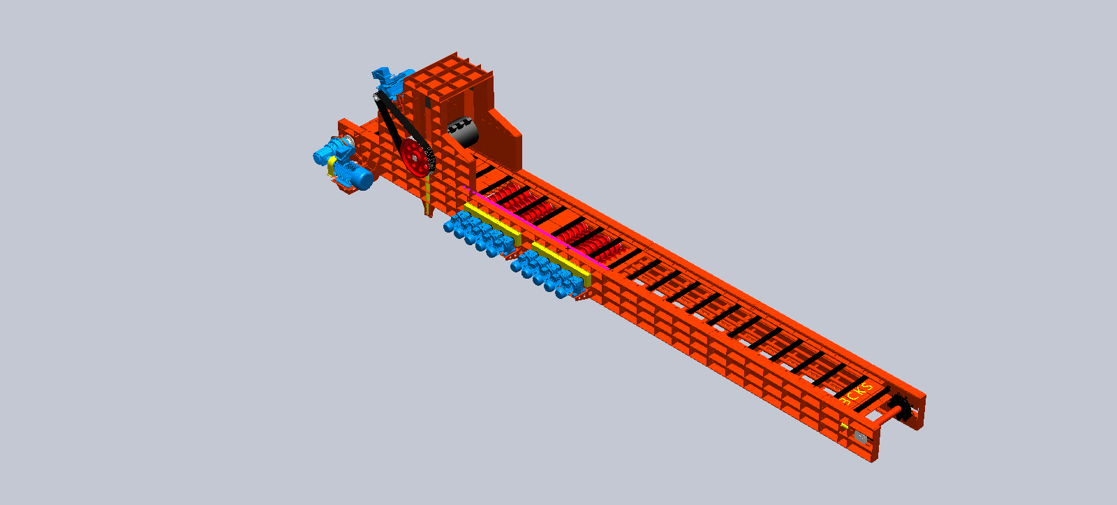 經(jīng)過組合設計,在頭部位置加裝破碎齒輥,破碎齒輥旋轉(zhuǎn)切線方向和物料運行方向由相反到一致,此過程破碎齒輥能有效咬住大塊物料破碎,小塊物料直接通過。直至頭部卸載,最終完成了物料的輸送和破碎雙重任務。